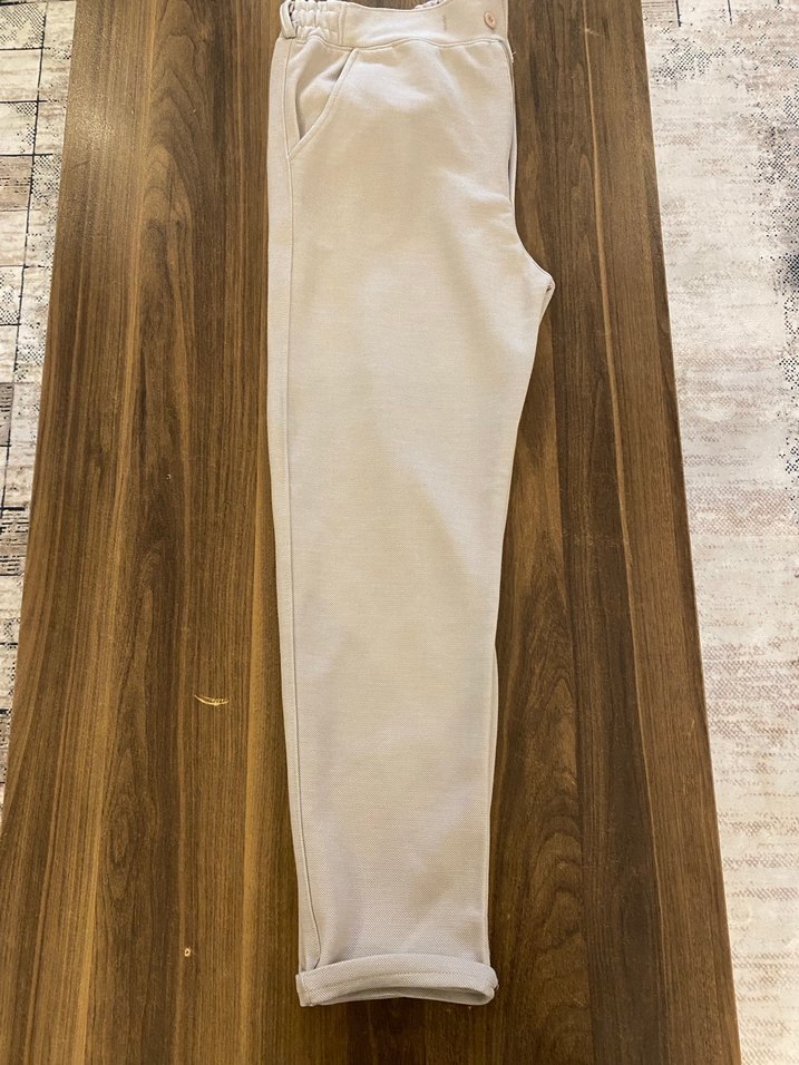 Bej keten kumaştan, normal boy ve regular fit kesime sahip kadın pantolon. Minimalist ve normcore tarz için uygun, günlük kullanıma ideal.