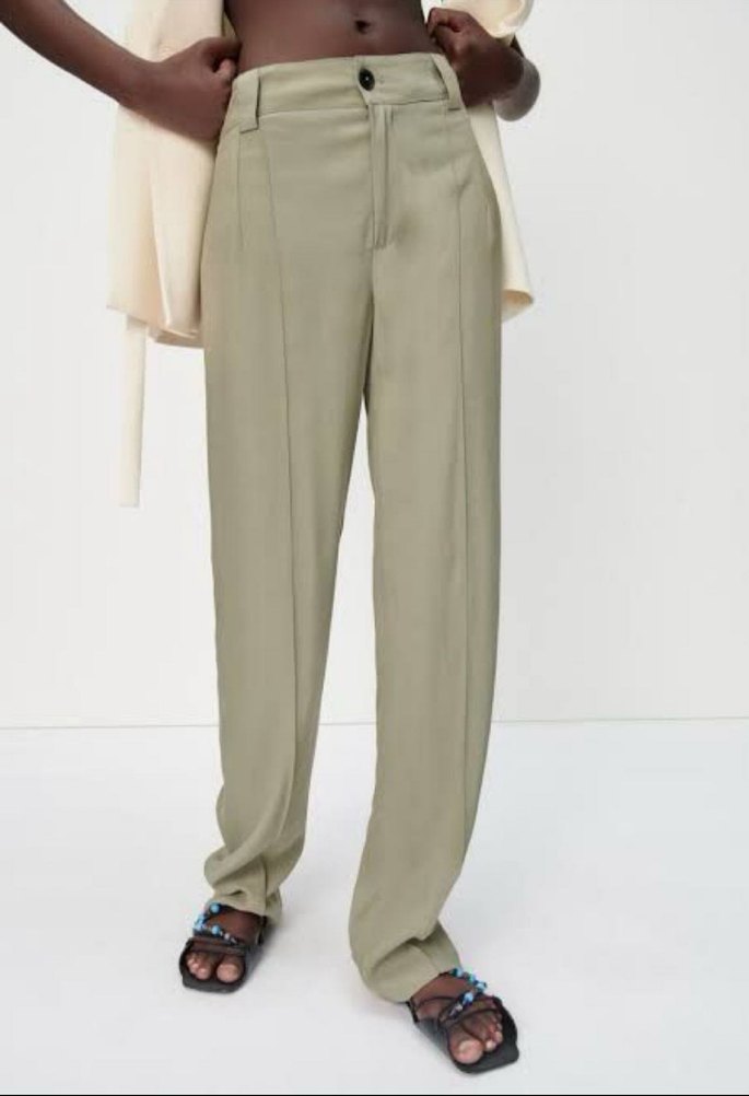 Bej keten kumaştan yapılmış, normal boy midi uzunluğunda, minimalist ve çağdaş tarzda, ofis için ideal rahat kesim pantolon. Desensiz, zahmetsiz şıklık sunar.