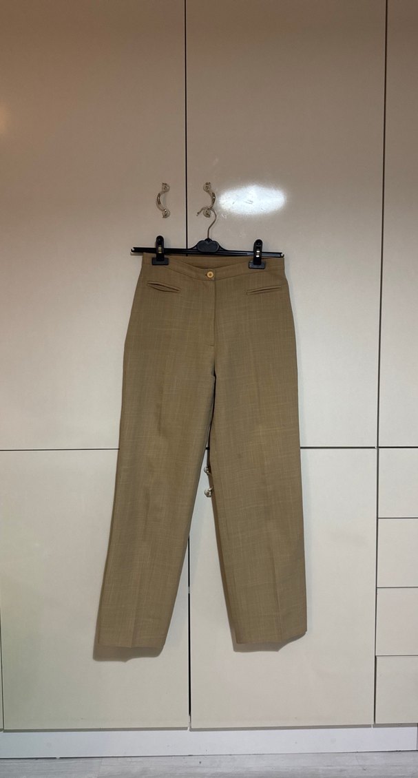 Bej renk, keten kumaştan yapılmış, midi kadın pantolonu. İş ve günlük kullanıma uygun, sade ve rahat kesimle tasarlanmıştır. Kusurlar fotoğrafla belirtilmiştir. Marka temsili.