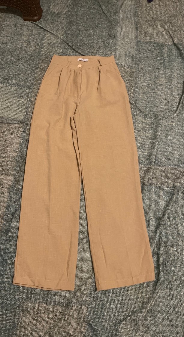Bej keten kumaştan, normal boyda ve regular fit kadın pantolon. Desensiz, rahat ve günlük kullanıma uygun şık bir parça.