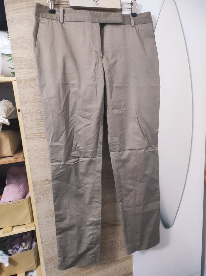 Bej keten kumaştan yapılmış, normal boy ve regular kesim kadın pantolon. Düz ve desen içermeyen tasarımıyla ofis için uygun, sade ve şık bir görünüm sunar. hiç giyilmedi