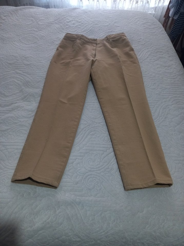 Bej keten kumaştan yapılmış, normal boy ve rahat kesim kadın pantolonu. Düz ve desen içermeyen tasarımı, ofis için uygundur. Casual ve normcore tarzda, zahmetsiz şıklık sunar.
