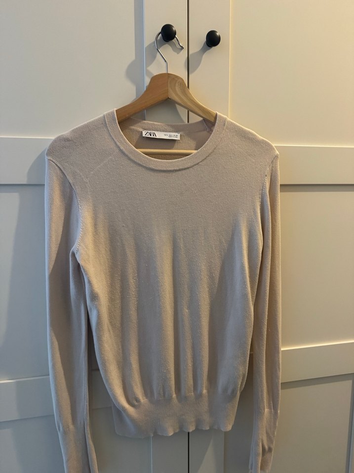 Bej keten kumaştan, yuvarlak yaka ve uzun kollu, salaş kesim normcore tarz triko. Günlük rahat kullanım için uygundur.