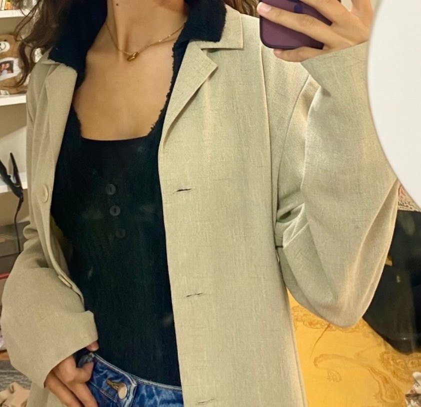 Bej renkli keten kumaştan yapılmış, normal boy midi blazer. Düğmeli, regular fit ve kesik kollu, ofis ve günlük kullanıma uygun.