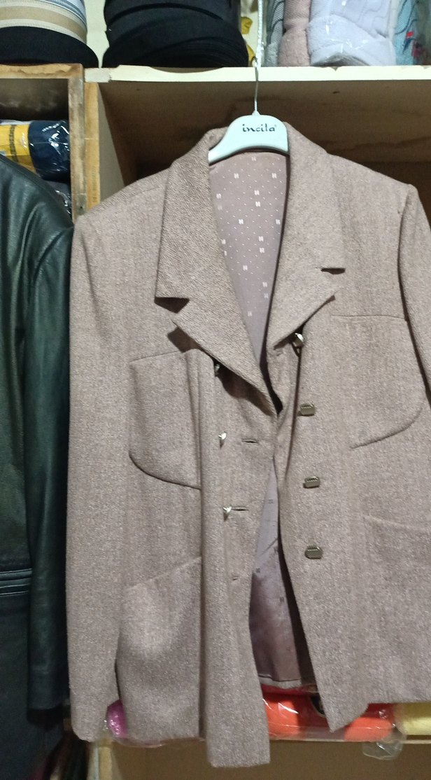 Bej keten kadın ceket, düğmeli ve kesik yakalıdır. Uzun kollu, normal kesim ve midi boyda olup ofis için uygundur. Desensiz, klasik bir sokak stili sunar.
