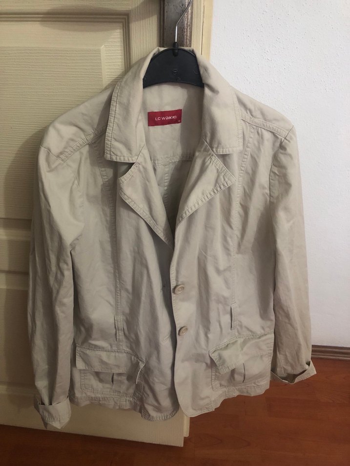 Bej keten kumaştan, düğmeli, uzun kollu, normal boy midi ceket. Ütüsüz olduğu için kırışık duruyor başka kusuru yoktur