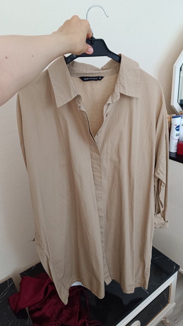 Bej renkli, keten kumaştan, uzun kollu, düğmeli ve yakalı, bol kesim midi gömlek. Günlük rahat sokak stili için uygundur.