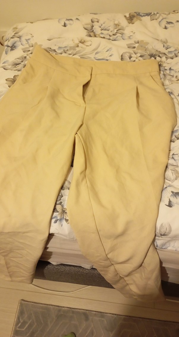 Bej renkte, keten kumaştan, bol kesim ve drapeli tasarıma sahip uzunlukta kadın pantolonu. Normcore stil ve günlük kullanım için uygun. Hiç giyilmedi