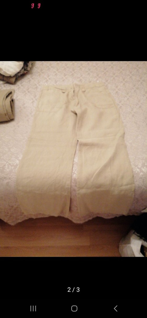 Bej renkli keten kumaştan, midi boy ve bol kesim kadın pantolon. Günlük kullanıma uygun, rahat ve şık bir seçenek. boyu 100 beli 38 paca 27 cm