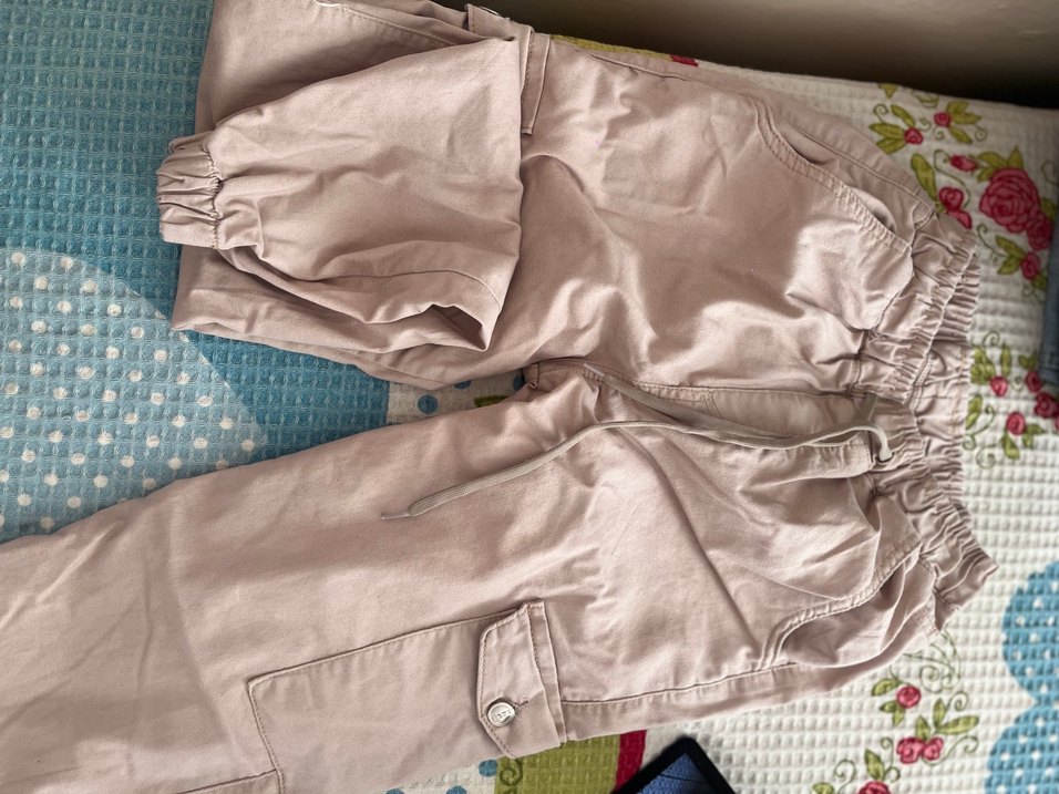 Bej keten midi uzunlukta, bol kesim ve düğme detaylı kadın pantolonu. Günlük kullanıma uygun sade ve desensiz tasarım.