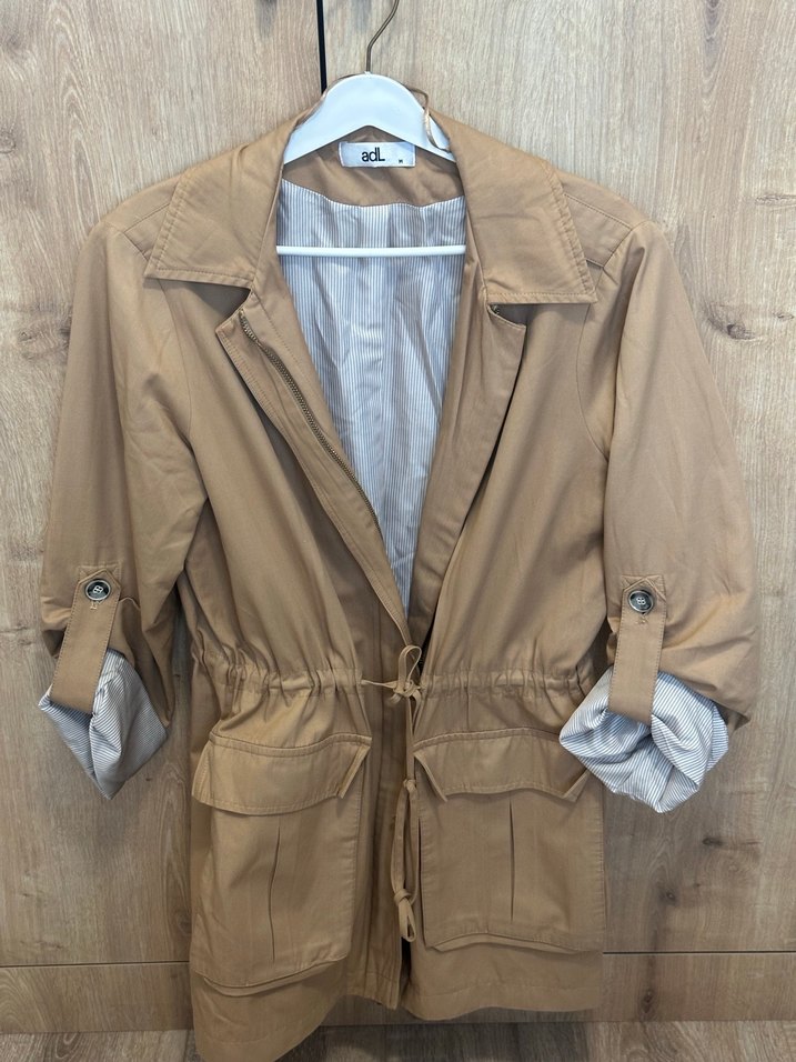 Bej renk keten midi trençkot, kesik yaka, düğmeli, uzun kollu. Ayarlanabilir bel bağcığı ve cep detayları ile rahat kesim, günlük sokak stili için uygun.