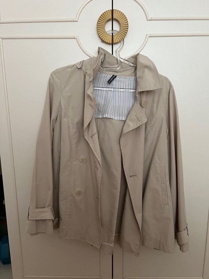 Bej keten midi trençkot, düğmeli ve yakalı. Uzun kollu, regular fit ve desensizdir. Günlük sokak stili için uygundur.