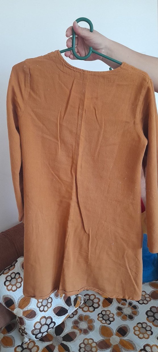 Uzun kollu, düğmeli bej keten tunik. Salaş kesimi ve yuvarlak yakasıyla sade bohem tarzı sunar. Günlük kullanıma uygundur.