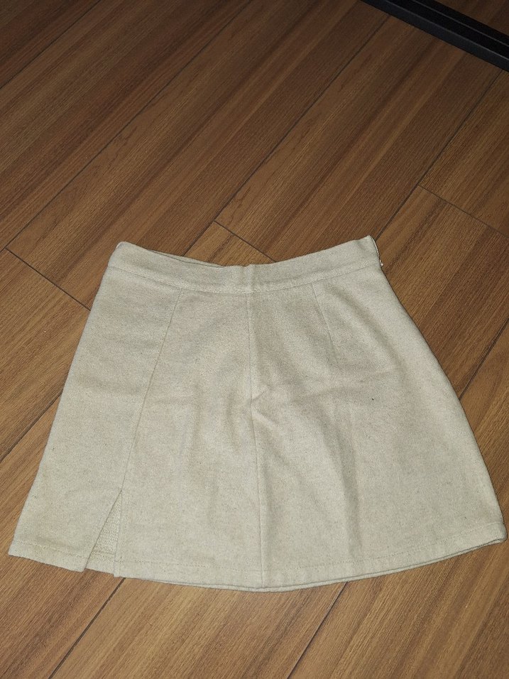 Bej keten kumaştan, bol kesim ve desensiz tasarıma sahip mini etek.