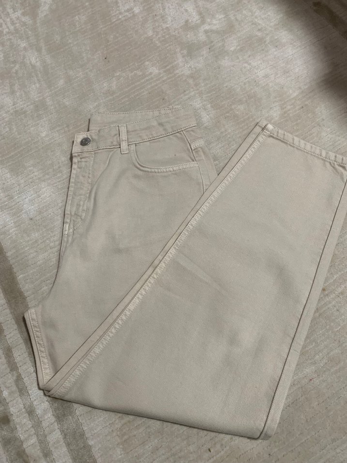 Bej yüksek bel boyfrent kesim ve kadın pantolon. Desensiz, günlük rahat kullanıma uygun.