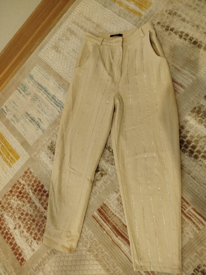 Bej renkli, keten kumaştan pilili bol kesim uzun kadın pantolonu. Günlük kullanıma uygun, rahat ve hafif bir tarza sahiptir.
