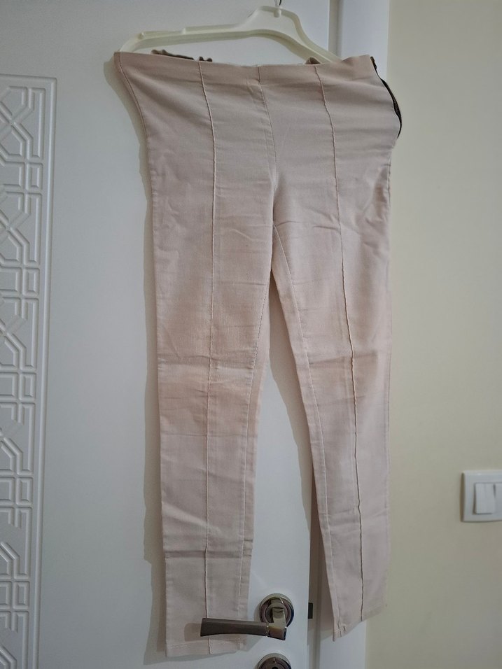 Bej renkli, keten kumaştan, pilili ve midi boy, normal kesim kadın pantolonu. Minimalist ve normcore tarzına uygun, günlük kullanıma elverişli.