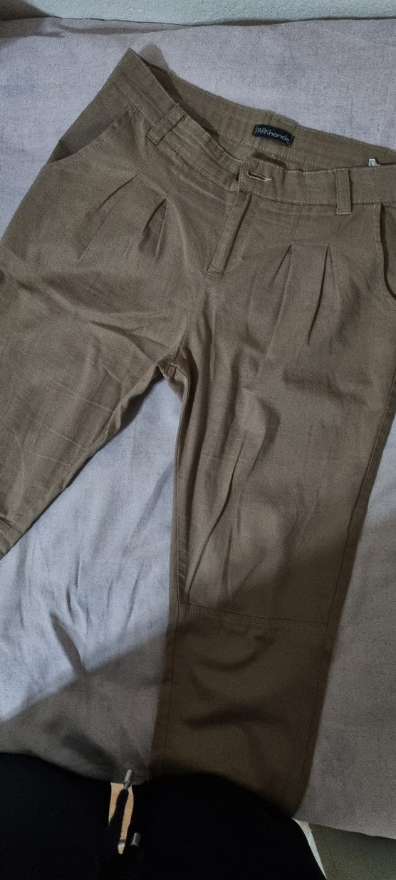 Bej pamuk ve elastan kumaştan, havuç pantolon. günlük kullanıma uygun rahat normcore tarzında. beli 40 cm boyu 96 cm için bacak ölçüsü 70 cm paçasında düğme detayı var