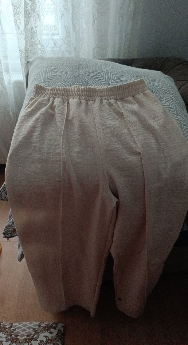 Bej renkte, keten kumaştan yapılmış, bol kesim ve pilili tasarıma sahip kadın midi pantolon. Rahatlık için lastikli bel bantlıdır, günlük kullanım için uygundur.