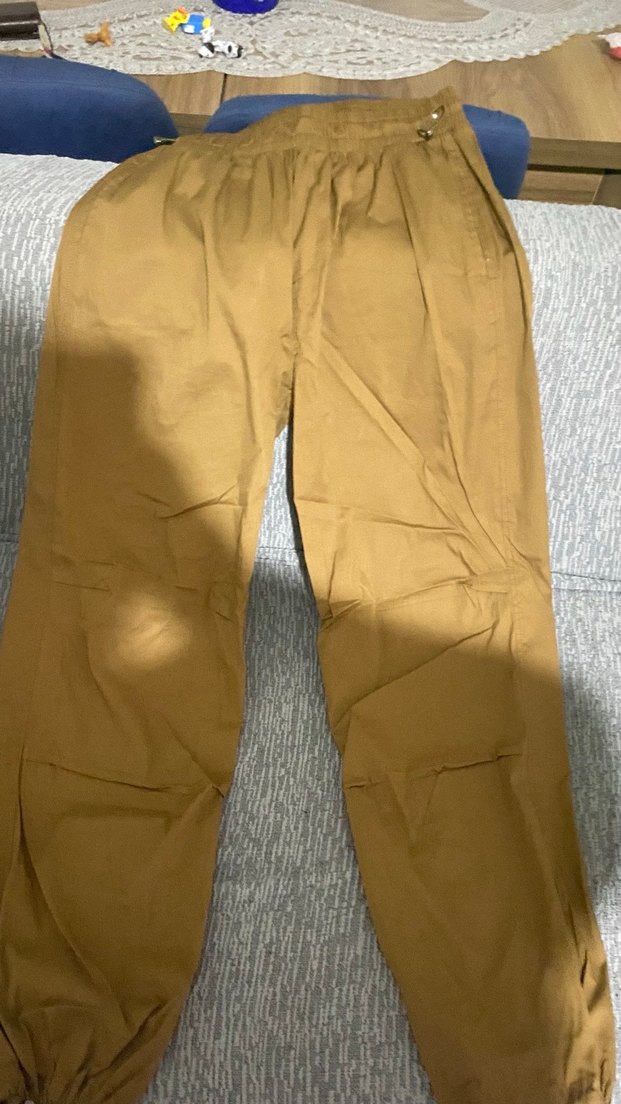 Bej keten kumaştan, pilili ve bol kesim rahat pantolon. Parlak görünümlü, günlük sokak stili için uygundur.