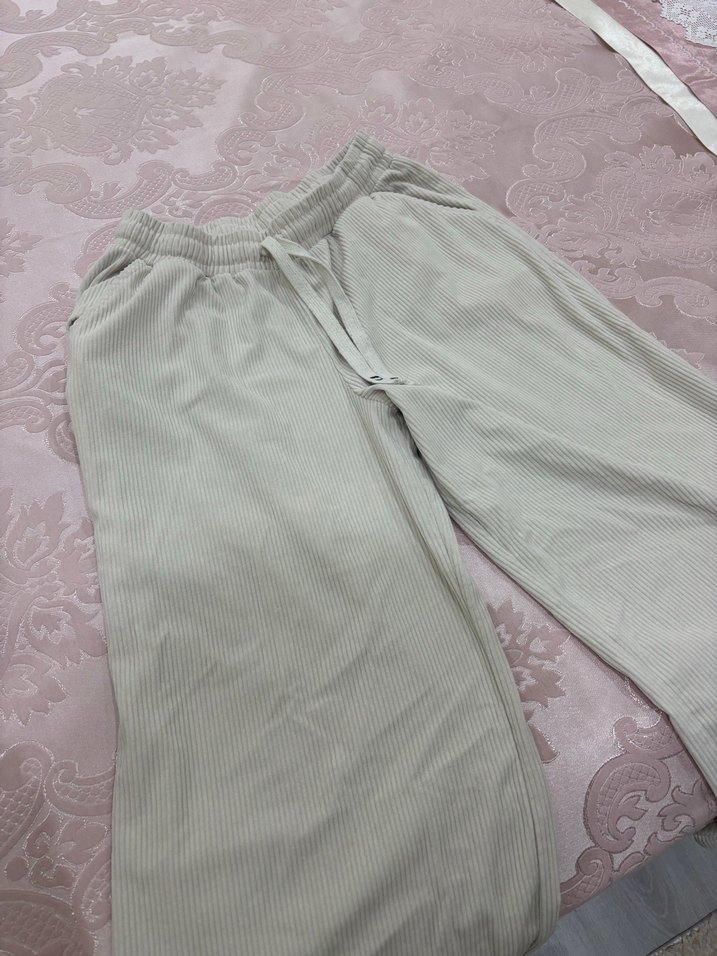 Bej renkli keten kumaştan, piliseli ve rahat kesim midi uzunluğunda kadın pantolonu, elastik bel bantlıdır.