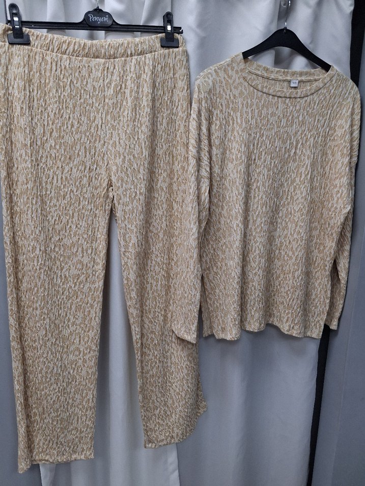 Hafif bej renkli opak kumaştan, bol kesim ve piliseli dokulu kadın ikili takım. Yuvarlak yaka ve uzun kollu, günlük kullanıma uygun rahat ve çağdaş tarzda.