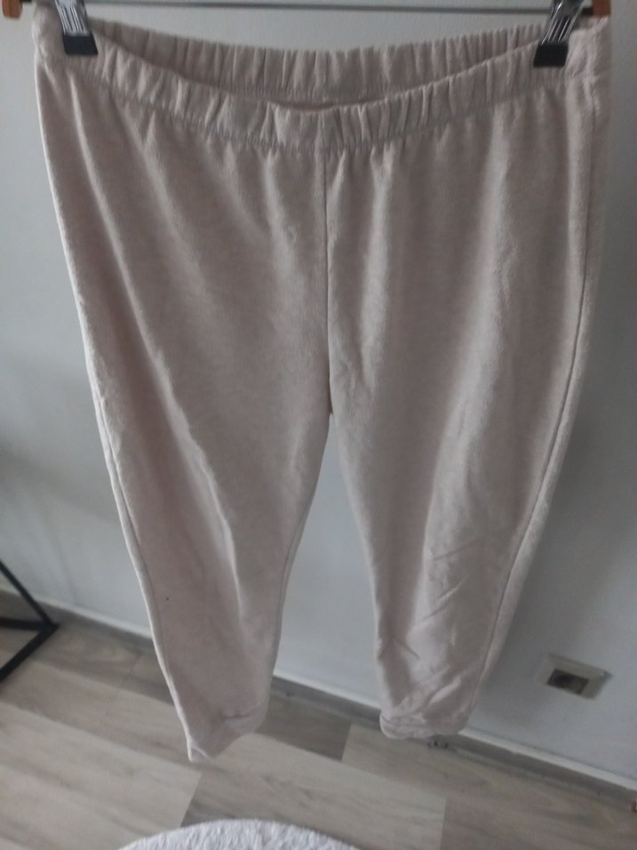 Bej keten kumaştan, rahat kesim ve normal boyda, günlük kullanıma uygun sade ve konforlu kadın pantolonu.
