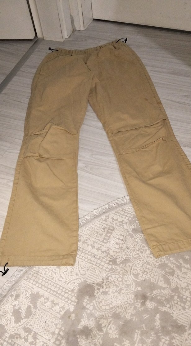 Bej renkli keten pantolon, bol kesim ve kemerli, parlak görünümlü. Günlük kullanım için rahat ve midi boyda, sokak tarzına uygun.