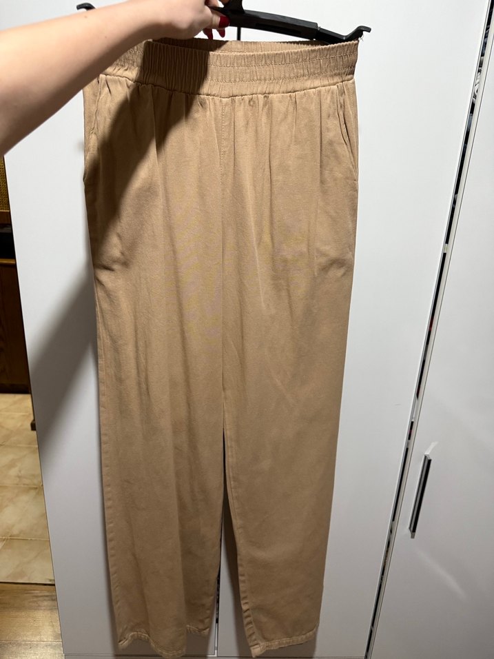 Bej renkli keten kumaştan, bol kesim ve midi boy pantolon. Rahatlık için lastikli beli vardır. Günlük kullanıma uygun