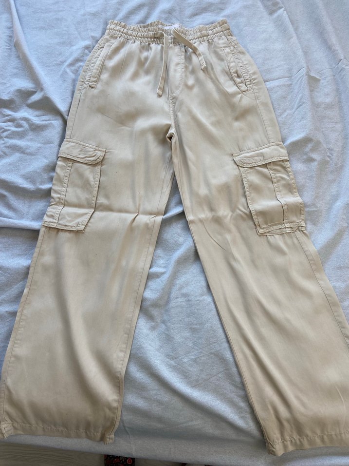 Bej keten kumaştan, rahat kesim ve midi boyda kadın pantolon. Yan cepleriyle günlük kullanıma uygun, sokak stiline uygun şık bir tasarım. Minik lekeleri var çıkarmak için hiç uğraşmadım kullanmadığım için leke çıkarıcı ile çıkacağını düşünüyorum