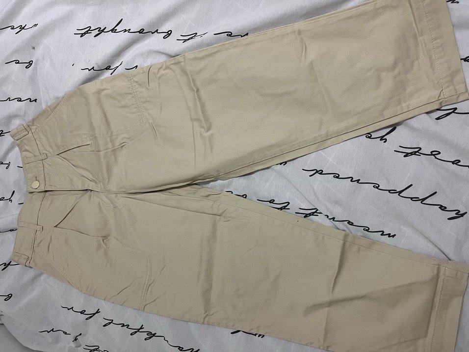 Bej keten kumaştan, bol kesim ve fermuarlı ceplere sahip kadın pantolonu. Midi boy ve sade tasarımlı, outdoor ve streetwear tarzına uygun.