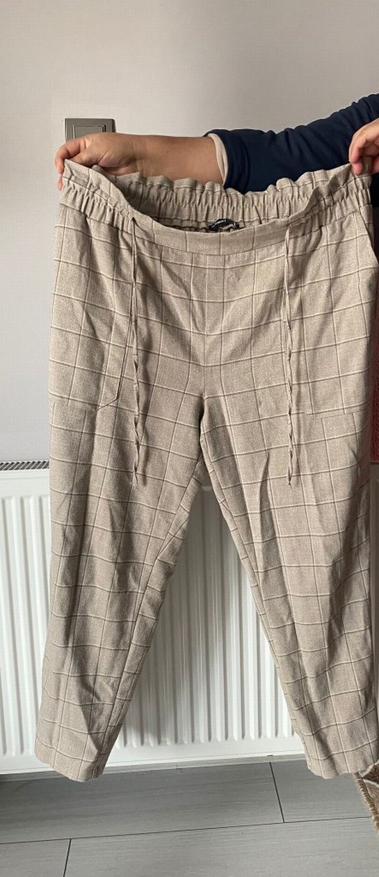 Bej keten kumaştan, rahat kesim ve midi boyda kadın pantolon. Düğmeli bel ve ince kare desenli, günlük rahat sokak stili için uygundur.