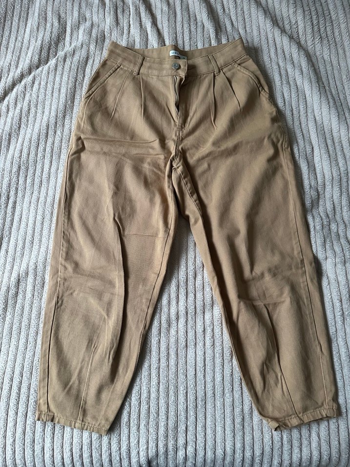 Bej keten kumaştan, bol kesim ve midi boyda, günlük rahat kullanım için uygun pantolon. Desensiz ve nötr tasarımıyla zahmetsiz şıklık sunar.