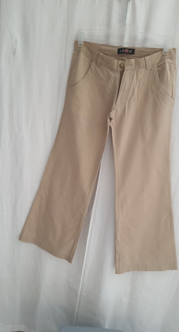 Bej keten kumaştan, rahat kesim ve midi boyda kadına pantolon. Günlük kullanıma uygun, zahmetsiz şıklık sunar.