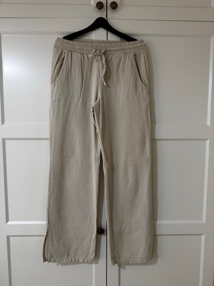 Bej keten kumaştan, bağcıklı bel ve yan cepli rahat kesim pantolon, günlük kullanım için sade ve şık.