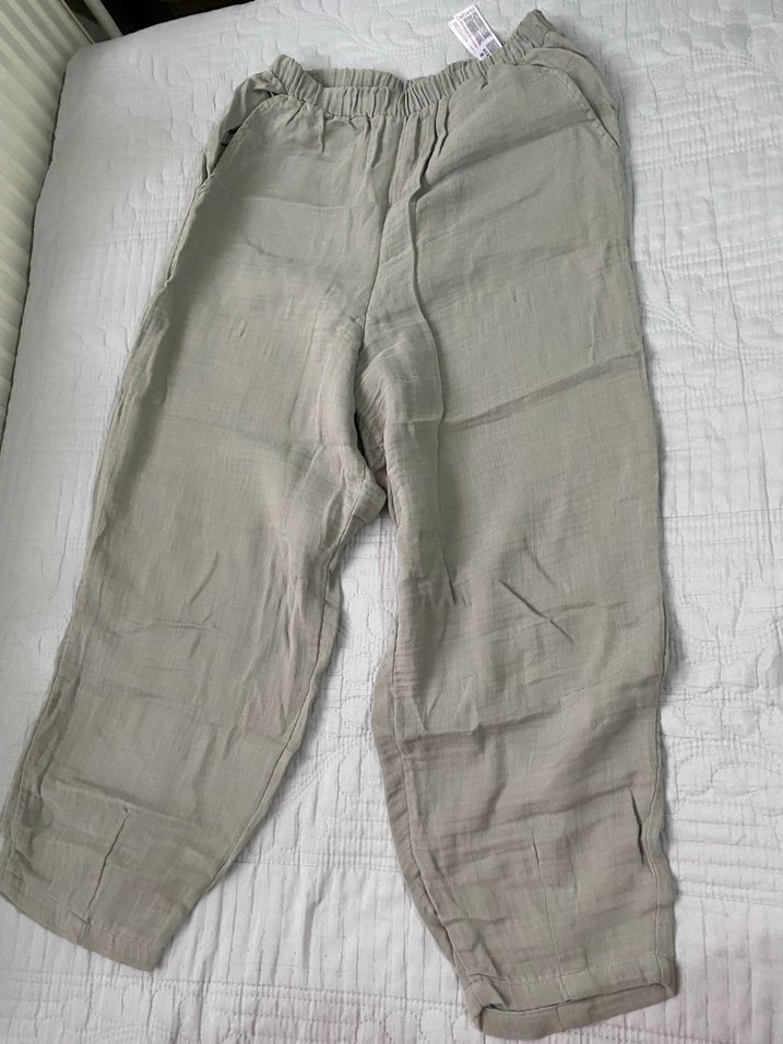 Bej keten kadın pantolon, rahat kesim ve midi boy ile günlük kullanım için sade ve konforlu bir stil sunar. Elastik bel bantlı, basic ve günlük tarzda.