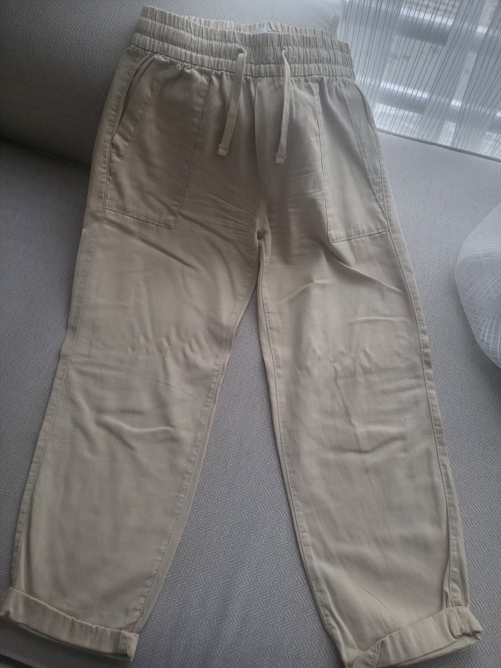 Bej renkli keten kumaştan, bol kesim ve elastik bel detaylı midi uzunlukta rahat pantolon. Günlük ve sokak stili için uygundur.