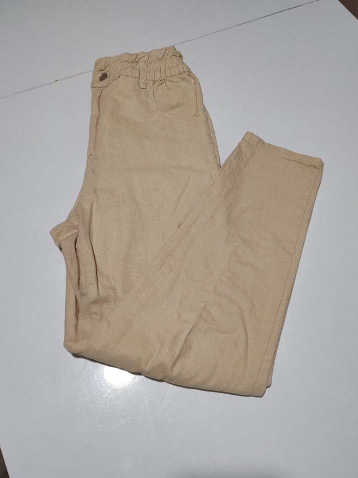 Bej renkli, keten kumaştan, rahat kesimli midi uzunlukta kadın pantolonu. Günlük sokak stili için uygun ve sade tasarım.