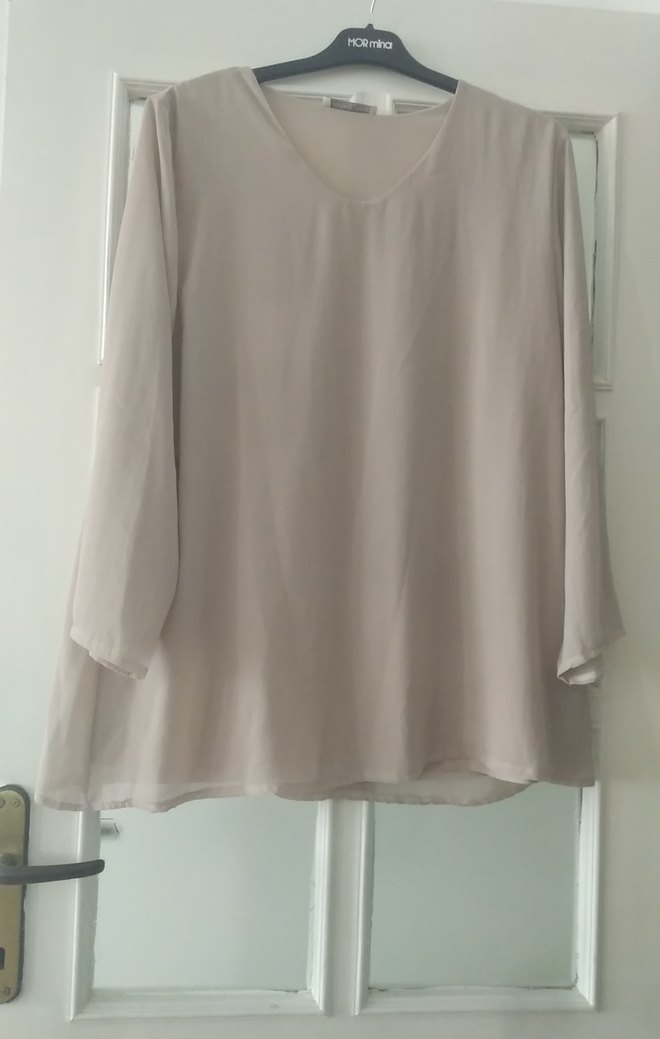 Yumuşak keten kumaştan, uzun kollu, bej rengi, salaş kesim ve drapeli detaylı, normal midi boyda kadın bluz. Minimalist günlük stil için uygundur.