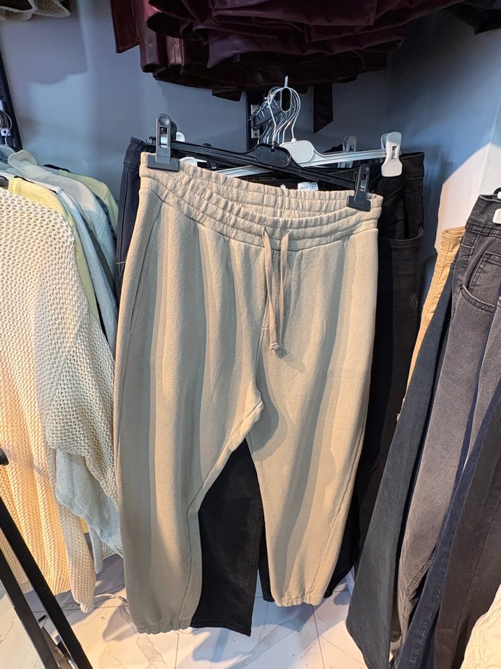 Bej keten kumaştan, salaş kesim ve lastikli beli bağcıklı kadın eşofman. Günlük kullanıma uygun, rahat ve şık bir sokak stili parçası. ️