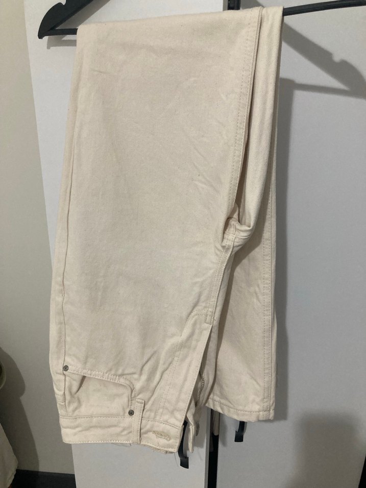 Bej keten kumaştan, salaş kesim ve midi boyda kadın kot pantolon. Günlük kullanım için sade, desensiz ve rahat bir tarz sunar.