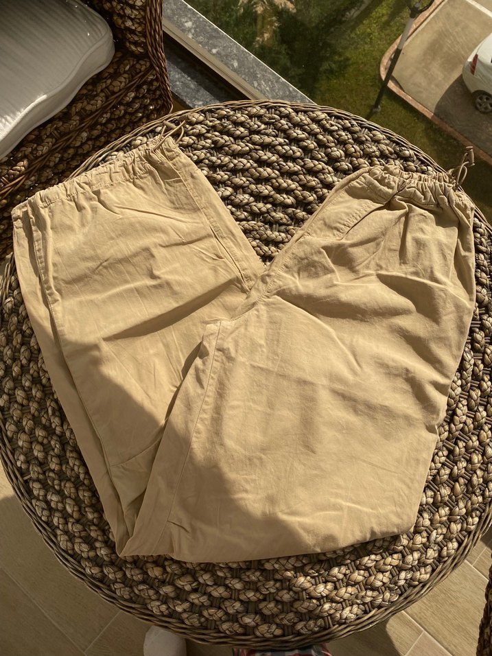 Bej renkte, keten kumaştan, salaş kesim ve midi boyda kadın pantolonu. Rahat ve şık bir sokak stili sunar.