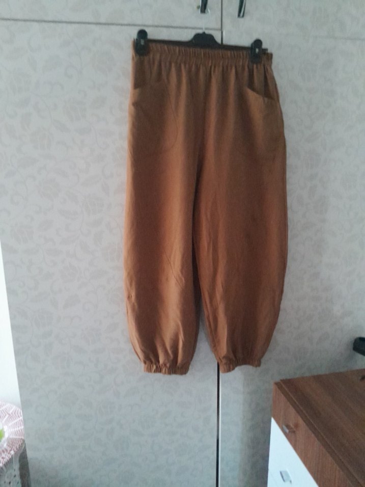 Bej renk, keten kumaştan kadın salaş pantolon. Midi boy, lastikli paçalarla rahat ve şık bir görünüm sunar. ✨