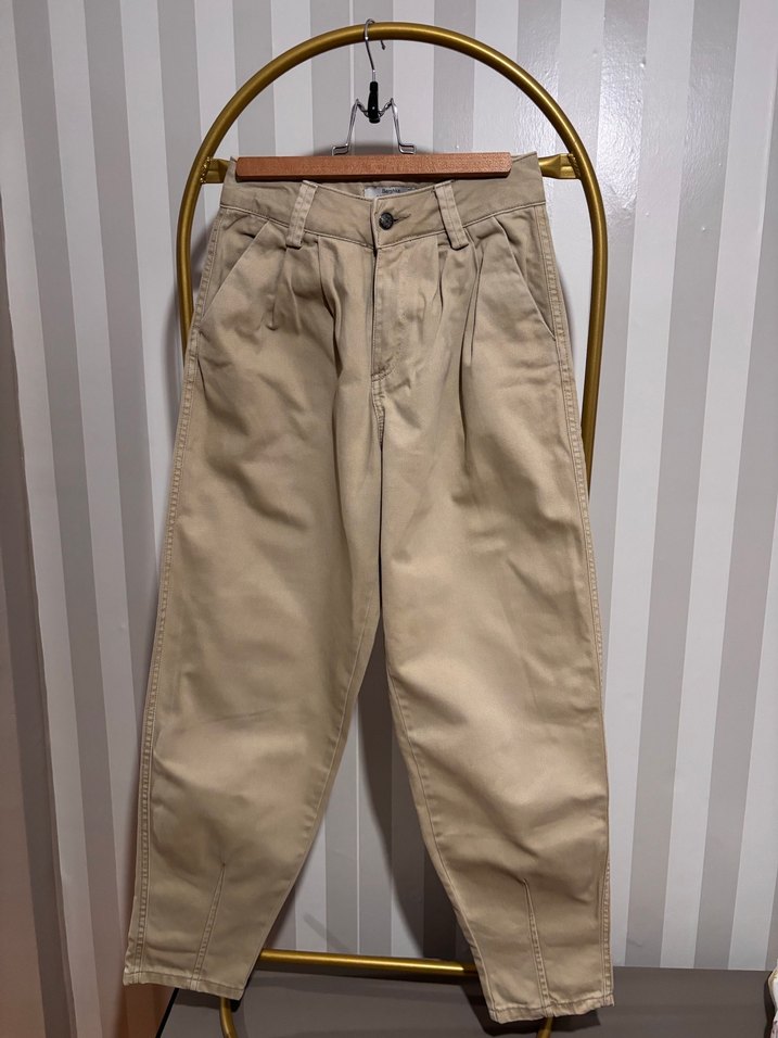 Bej renkte keten kumaştan, midi boyda, desen içermeyen salaş kesim kadın pantolonu, rahat günlük kullanım için uygun. Bel 32 cm boy 97
