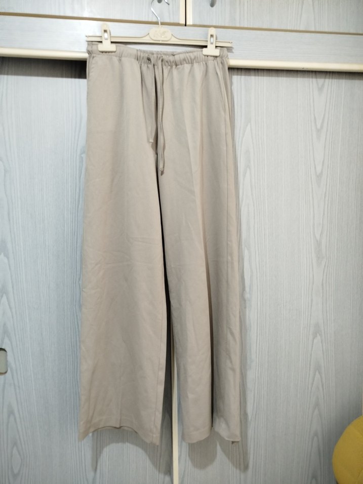 Bej keten kumaştan, bol kesim ve uzun paçalı kadın pantolonu, sade ve minimal tarzıyla günlük kullanım için uygundur.