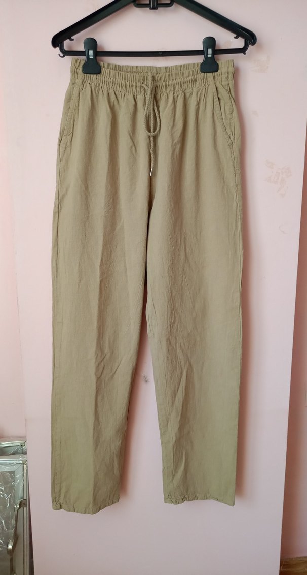 Bej renkli keten, salaş kesim, midi boy pantolon. Günlük rahat kullanım için ideal, zahmetsiz şıklık sunar.