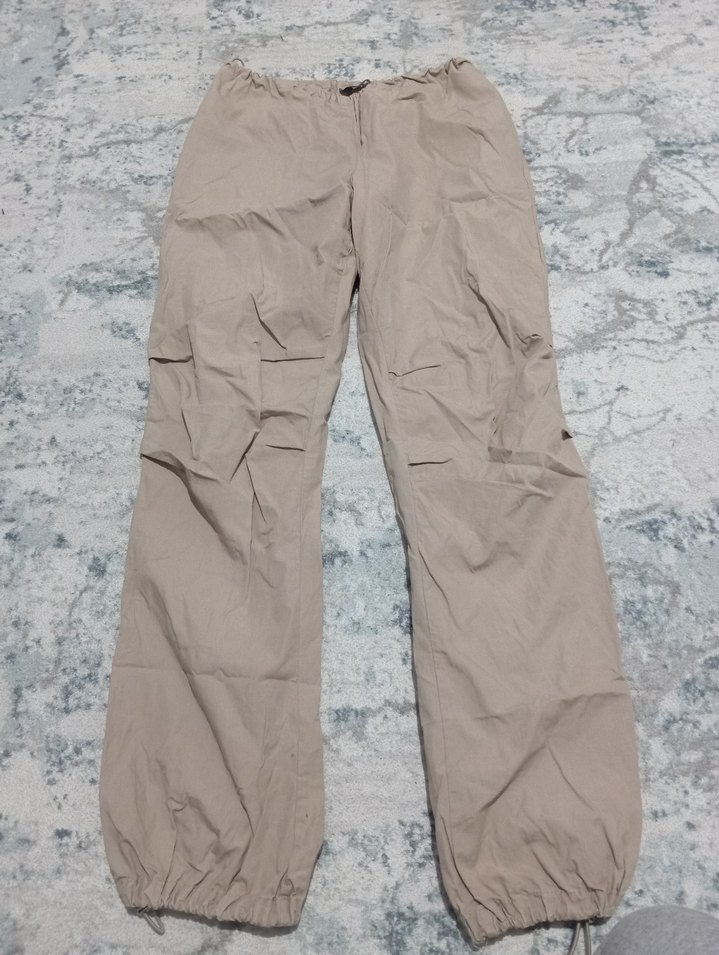 Bej keten kumaştan, salaş kesim ve midi boyda kadın pantolonu. Elastik paçalarla rahat ve şık bir dış mekan tarzı sunar. Hiçbir yerinde sorun yoktur. Bel ve paça kısımlarında ayarlanabilir lastik bulunmaktadır.