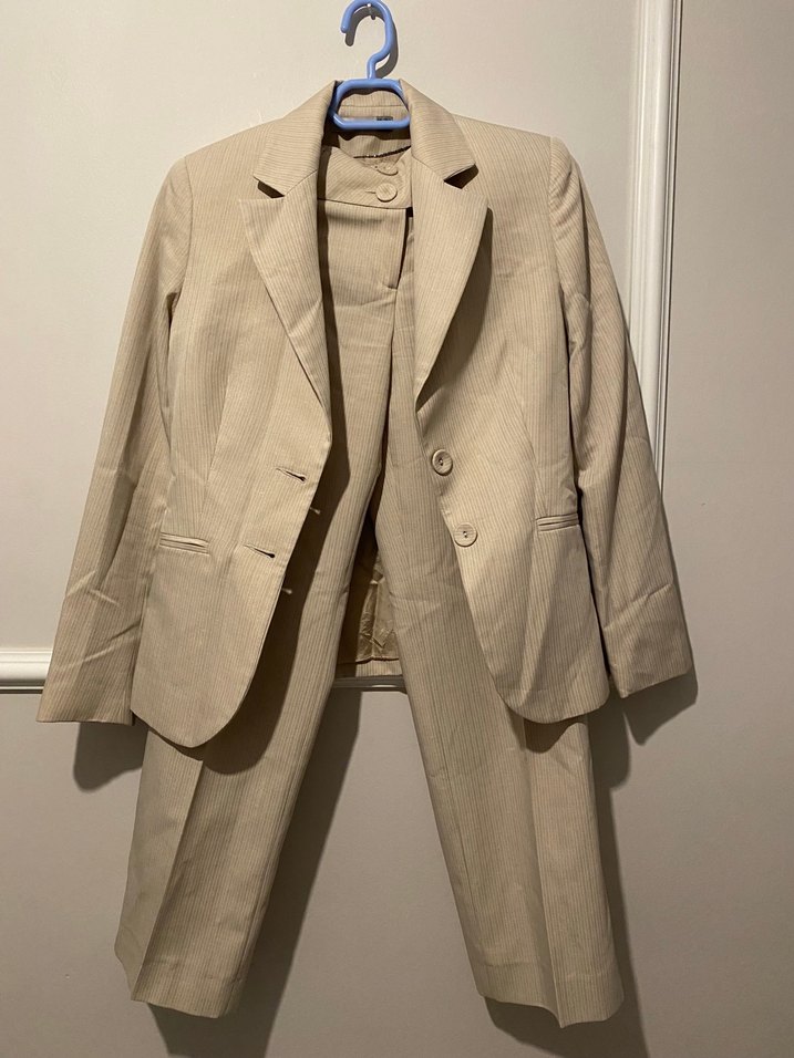 Bej kadın keten takımdır. Düğmeli, uzun kollu ve normal boy midi etek içerir. Ofis için uygun, klasik ve şık görünümlüdür.