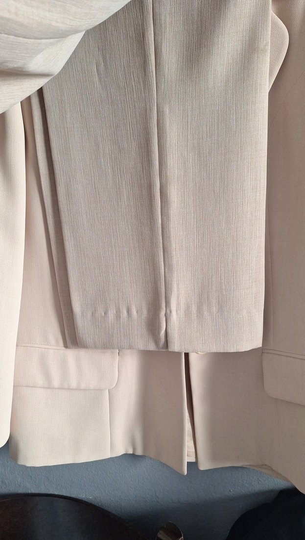 Bej renkte keten kumaştan yapılmış, pile detaylı pantolon