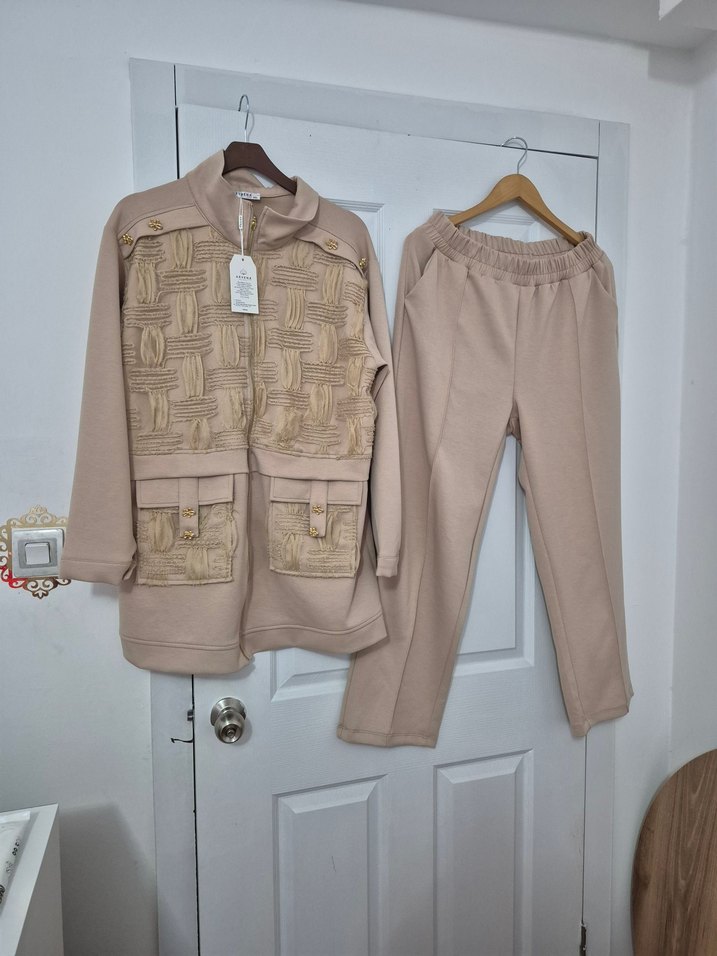 Bej renkli, keten dokulu kadın takımı. Fermuarlı, yakası kesik ve uzun kollu üst ile regular fit pantolon içerir. Rahat ve şık günlük kullanım için uygun.